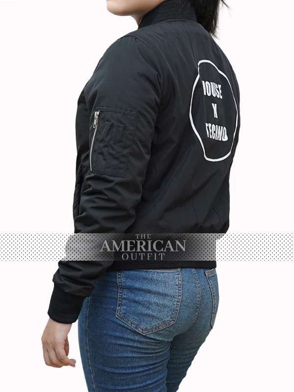 Now let me tell you about the pockets of this Music Festival Techno Bomber Jacket. You get 5 pockets with it, two at the front and two inside the jacket, and the left one is at the sleeve of this jacket. There is a House X Techno Logo on the Front and Back of this jacket that makes the jacket more attractive.